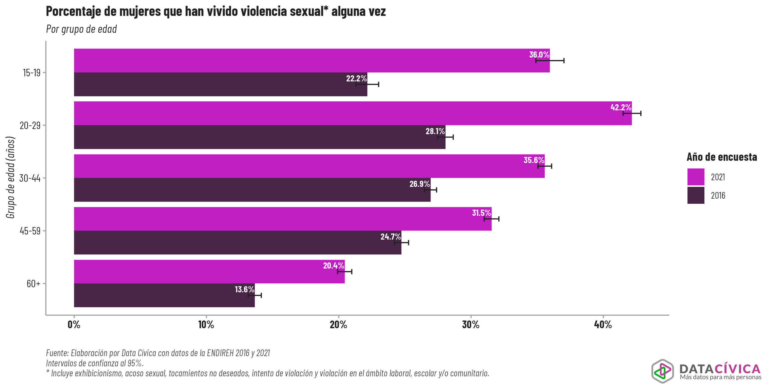 Al analizar la ENDIREH confirmamos que el aumento en cifras de violencia sexual no es una especificidad de una sola encuesta. Para cada uno de los siete tipos de violencia sexual que aborda, la ENDIREH evidencia un incremento significativo en el porcentaje de mujeres que han sido victimizadas. Por ejemplo, en tan sólo los cinco años transcurridos entre la aplicación de la ENDIREH 2016 y la ENDIREH 2021, la proporción de mujeres que reportó haber sufrido alguna vez tocamientos no deseados en su escuela, trabajo y/o comunidad aumentó de una de cada siete (15.0%) en 2016 a una de cada cuatro (22.3%) en 2021. Asimismo, el porcentaje de mujeres encuestadas que habían sufrido intimidación sexual aumentó del 12.1% en 2016 al 19.9% en 2021, y en el caso de victimización por exhibicionismo, aumentó del 10.4% al 14.8%.