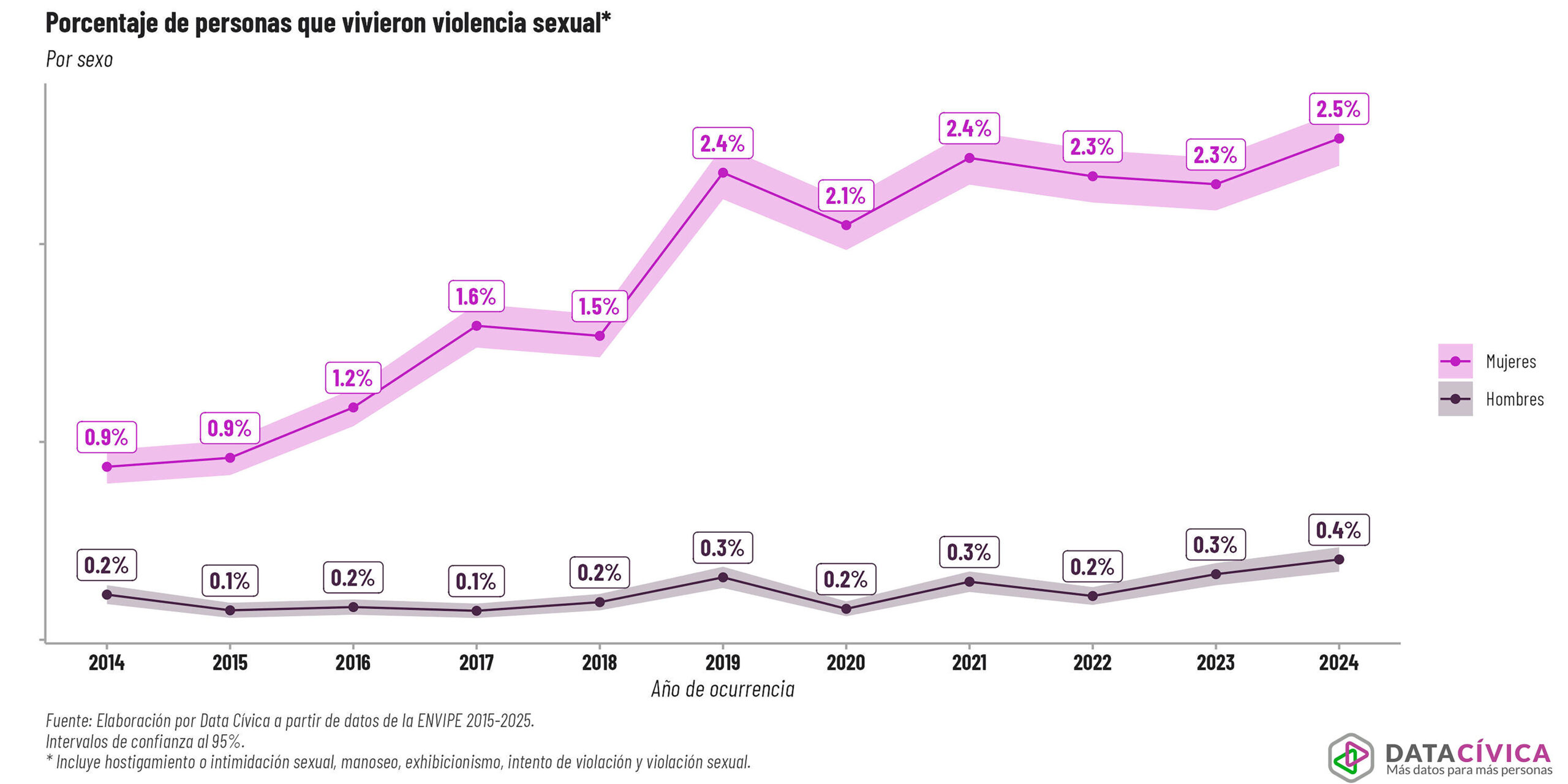 Los datos de la ENVIPE nos dicen que sin importar si han denunciado ante las autoridades, el porcentaje de personas encuestadas que reporta haber vivido algún delito sexual ha aumentado tanto a lo largo de la última década que hoy está en el punto más alto del que tiene registro la ENVIPE, tanto para mujeres como para hombres. De 2014 a 2024 el porcentaje de mujeres que reportaron haber sufrido un delito sexual durante ese mismo año pasó de 0.9% en 2014 a 2.5% en 2024. Es decir, en 2024 era casi tres veces más común vivir este tipo de violencia que hace una década.