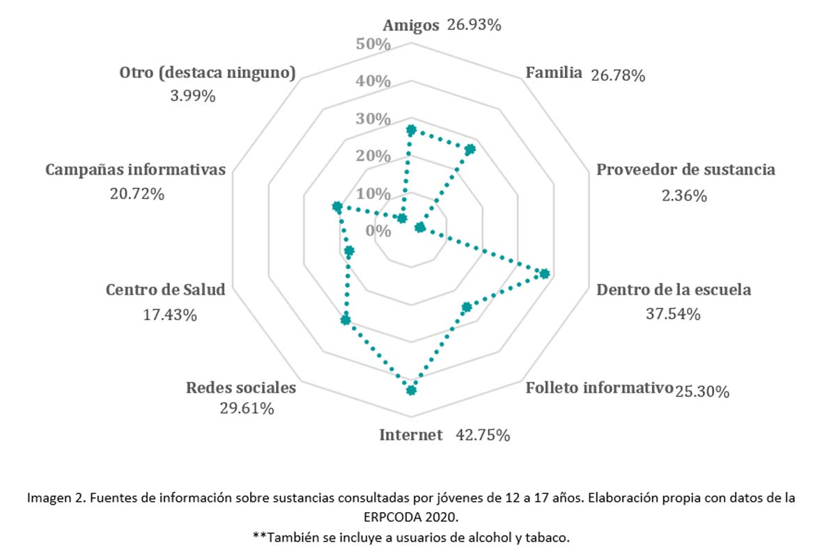 En el caso de las campañas publicitarias, se prefieren medios tradicionales, como la televisión o la radio, mientras los nuevos medios han quedado relativamente relegados.6 Los resultados de la Erpcoda muestran que las campañas informativas sobre sustancias en medios tradicionales son menos recurridas por las y los adolescentes. De hecho, las juventudes recurren más a medios digitales como el internet (42.74 %) o las redes sociales (26.61 %) para informarse acerca de las sustancias que consumen o buscan consumir.