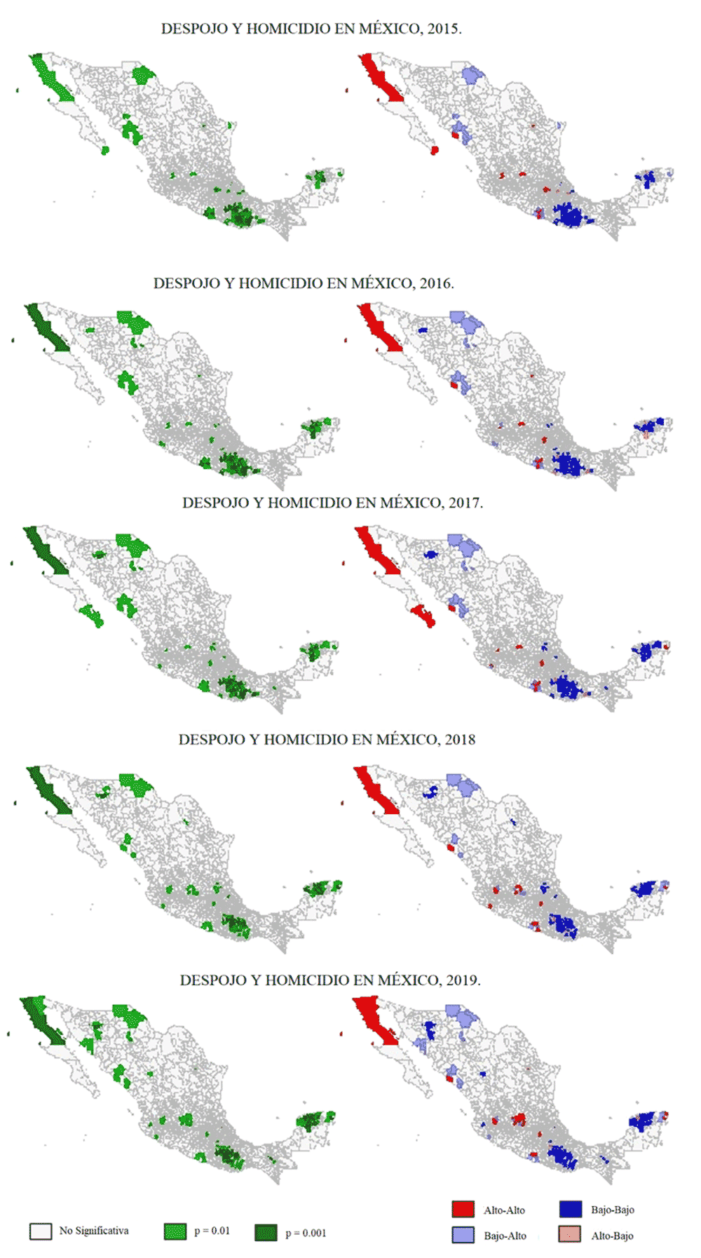 En algunos casos —marcados por el color rojo oscuro—, el despojo y el homicidio parecen generar conglomerados en los que ni la vida ni la propiedad pueden darse por sentadas. Esta coloración representa a aquellos municipios con altos niveles de despojo rodeados de municipios con altos niveles de homicidio (alto-alto) y comprenden 15 % de todos los municipios en los que la asociación “despojo-homicidio” fue significativa. Los otros casos —que aparecen en azul— muestran aquellas zonas del país en las que los niveles de despojo y homicidio son bajos y la relación es significativa. Por cada año analizado, hay una media de 163 municipios en este caso. Esta relación experimentó la mayor cantidad de cambios durante el tiempo analizado, ya que el número de municipios donde tanto el despojo como los homicidios fueron bajos aumentó de 141 en 2015 a 190 en 2019.