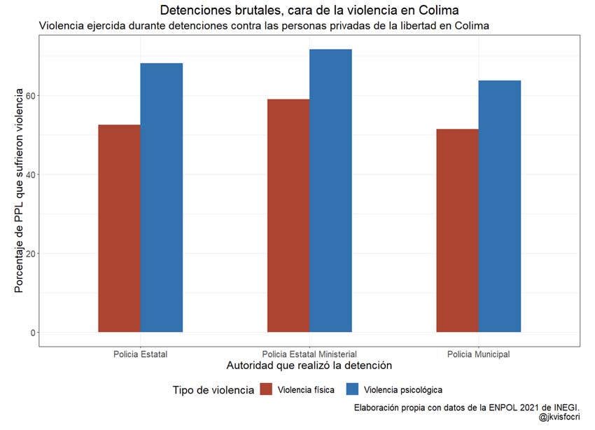 De acuerdo con datos de la Encuesta Nacional de Población Privada de la Libertad 2021, 65 % de las personas privadas de la libertad que fueron detenidas en Colima experimentaron algún tipo de violencia psicológica durante la detención, mientras que 53 % de los detenidos experimentó algún tipo de violencia física. A nivel nacional, estas proporciones alcanzan 63 y 48 %, respectivamente. Al desagregar los datos por tipo de corporación a nivel estado y municipio (policías municipales, policía estatal preventiva y policía estatal ministerial), podemos ver que la mayoría de las personas detenidas sufrieron algún tipo de violencia.