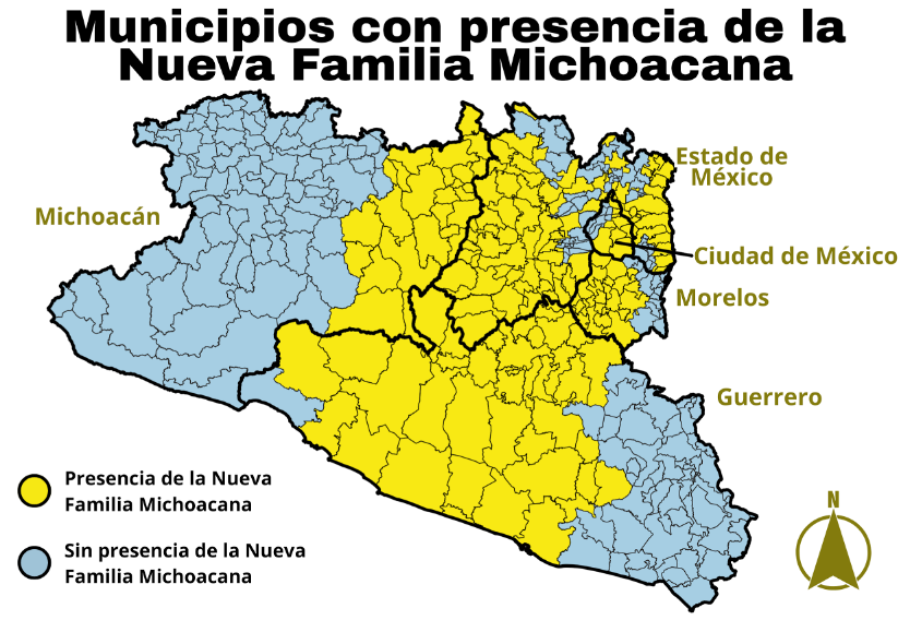 Motivados por la alta participación en el mercado de la producción de opio, la ahora conocida como Nueva Familia Michoacana, incrementó sus ingresos y comenzó un proceso de expansión importante, al grado que hoy se encuentra presente en 174 municipios de cinco entidades del país. Operan en 86 de los 125 municipios del Estado de México, en 39 de los 85 que hay en Guerrero, en 26 de los 113 de Michoacán, en 23 de los 36 de Morelos y en 9 de las 16 Alcaldías de la Ciudad de México. Esta cobertura es producto de una investigación propia, cuyas fuentes pueden ser consultadas en el siguiente enlace y de forma gráfica se muestra en el siguiente mapa.