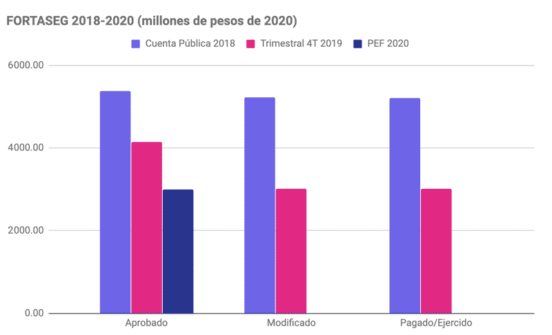 Aquí, debemos pausar y prestar atención especial al Fortaseg, un subsidio que cubre aspectos críticos para el desarrollo de policías confiables y eficiente, como la evaluación de control de confianza a los elementos operativos, su capacitación, la homologación policial y la mejora de condiciones laborales. Y sin embargo, este subsidio fue decreciendo hasta su inminente desaparición en 2021.