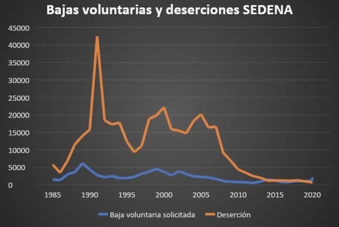 Las estadísticas de incidencia de tortura no son públicas; sin embargo, la alta tasa de deserción del personal militar podría estar relacionado con estas prácticas. De acuerdo con la información pública de la Sedena, entre 1985 y 2022 han desertado 402 104 soldados y otros 82 820 han solicitado su baja voluntariamente.1 Teniendo en cuenta que en promedio la Sedena cuenta con 250 000 elementos, podríamos decir que el equivalente a dos ejércitos mexicanos ha desertado o se han dado de baja por completo en el lapso de las últimas tres décadas.
