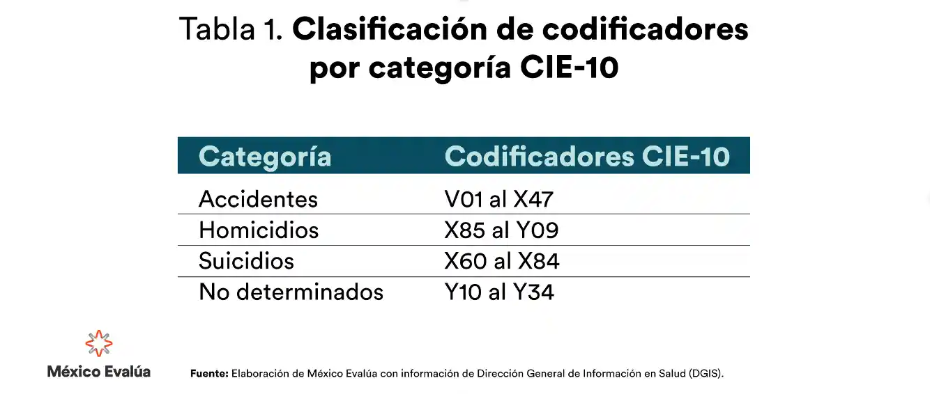 En el capítulo de la clasificación CIE 10 sobre causas externas de morbilidad y de mortalidad se encuentran codificadas las defunciones por “accidente”, “agresión” (homicidio), “lesiones intencionalmente autoinfligidas” (suicidio) y “evento de intención no determinada” (no determinado). Cada una de estas categorías están divididas en subcategorías detalladas sobre la causa de defunción, según codificadores del CIE-10, como mostramos en la Tabla 1.