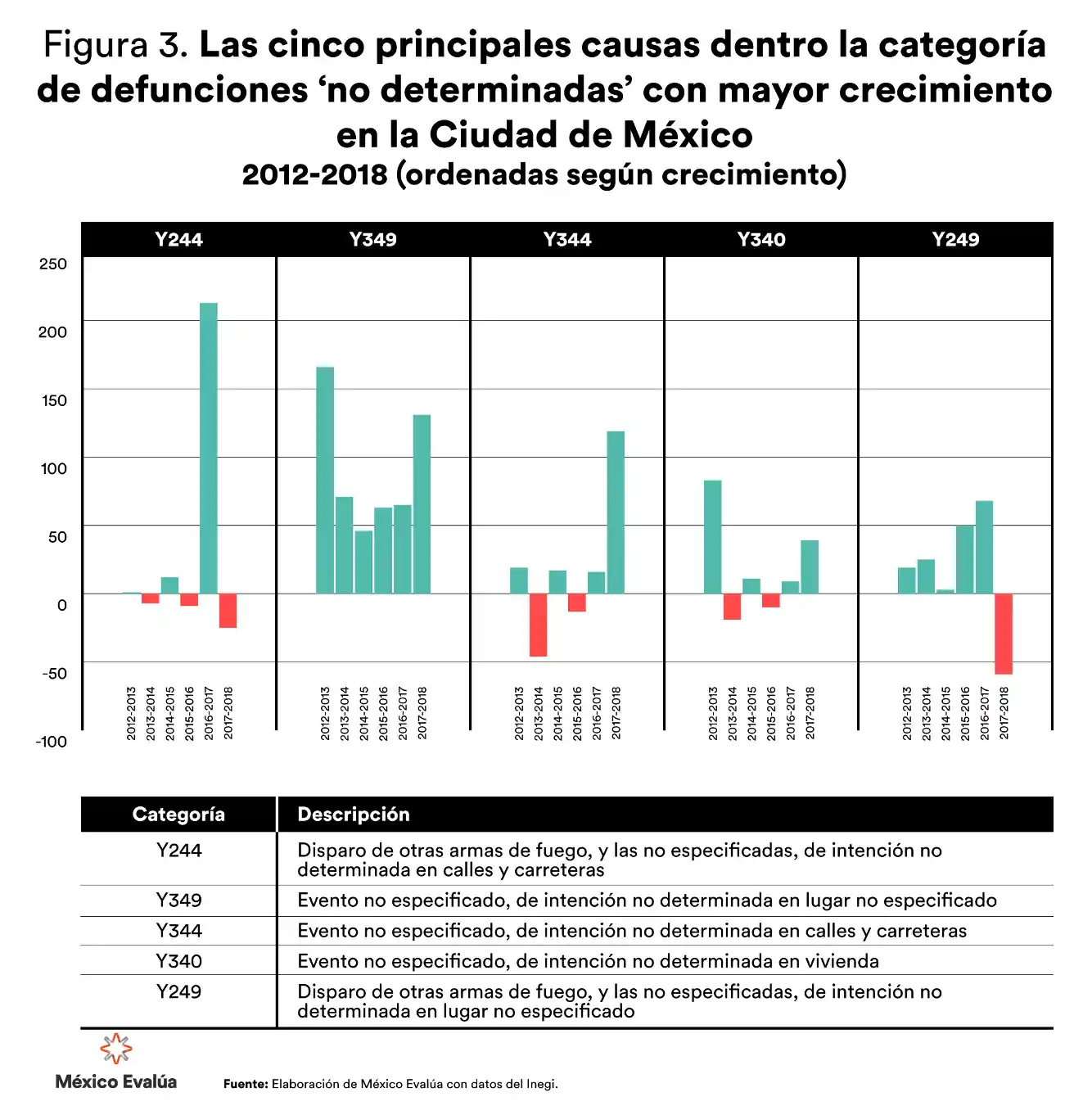 Como lo muestra la Figura 3, encontramos que la categoría de defunción (Y244) por “disparo de otras armas de fuego, y las no especificadas, de intención no determinada en calles y carreteras” es la que más contribuye al aumento de defunciones por causas no determinadas en 2017, año con el crecimiento más pronunciado en este tipo de defunciones: de 15 a 228. Cabe señalar que las defunciones con armas de fuego en lugar no determinado figuran como la quinta causa con mayor crecimiento entre 2012 y 2017. Sin embargo, para el conjunto del gobierno de Mancera, la categoría con crecimiento constante, año tras año, es la de defunciones para las cuales no tenemos ningún tipo de información (Y349). Es decir, efectivamente, para la mayor parte del periodo 2012-2018 no sabemos nada sobre la causa de muerte. Para otros casos, si bien no se determina el tipo de medio utilizado, al menos sí sabemos que murieron en calles y carreteras (Y344) o en vivienda (Y340).