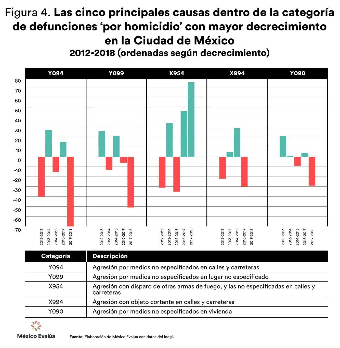 Uno de los argumentos que se han planteado en la reciente discusión es que se podrían estar reclasificando homicidios en la categoría de “no determinados”. Eso nos lleva a analizar las cinco principales causas de defunción con mayores decrementos en la categoría de homicidios, y que mostramos en la Figura 4. Nos interesa particularmente el periodo de 2015 a 2018, cuando se observa un incremento inicial en la categoría de “no determinado”. Las dos principales causas de homicidios con mayor decrecimiento no nos dan mayor información sobre los medios utilizados (Y094 y Y099). Se destaca, además, el uso de armas de fuego como tercera causa de homicidio (Y954).