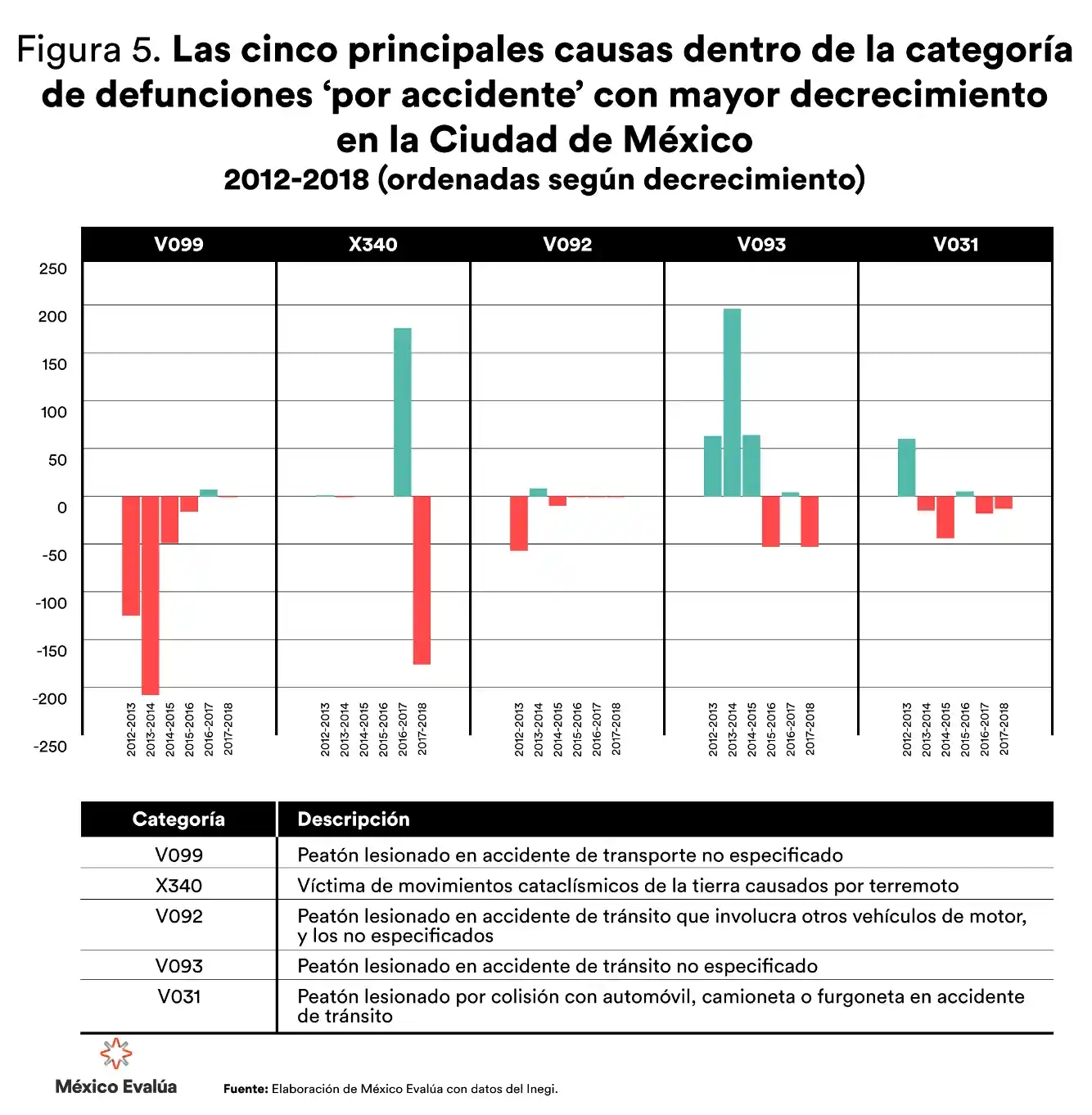Dado el decrecimiento de muertes por accidentes en el gobierno de Mancera (en contraste con el crecimiento de defunciones no determinadas), en la Figura 5 examinamos las cinco principales causas de tales defunciones. En general, encontramos una reducción más pronunciada de muertes de peatones lesionados en distintas formas de transporte (probablemente como resultado de una serie de cambios de políticas de movilidad y tránsito que se implementaron desde el gobierno de Marcelo Ebrard y continuaron bajo Miguel Ángel Mancera), seguida de defunciones por el sismo de 2017. Observar estos patrones nos despeja dudas sobre problemas de clasificación que pudieran igualmente explicar el aumento de defunciones “no determinadas”.