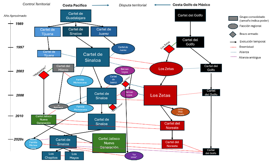 Desde entonces, la presión política de EE.UU. para que México ataque a los cárteles mediante estrategias agresivas de decapitación e interdicción ha sido constante. ¿Cuáles han sido los resultados tras varias décadas de esta estrategia? El siguiente gráfico presenta un resumen de las múltiples sagas y villanos de la guerra contra el narcotráfico en México desde 1989: