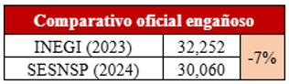 También, durante las conferencias de prensa matutinas se han realizado comparaciones tendenciosas entre las bases del INEGI y las del SESNSP. Por ejemplo, en 2024, el SESNSP reportó 30,060 homicidios dolosos, mientras que el INEGI contabilizó 33,550, una diferencia de 3,490 casos. Esta diferencia es aprovechada por el gobierno federal al momento de hacer comparativos entre 2023 y 2024, lo que permite presentar reducciones, en vez de los aumentos verificables al comparar las cifras de una misma fuente, como puede apreciarse en las siguientes tablas:
