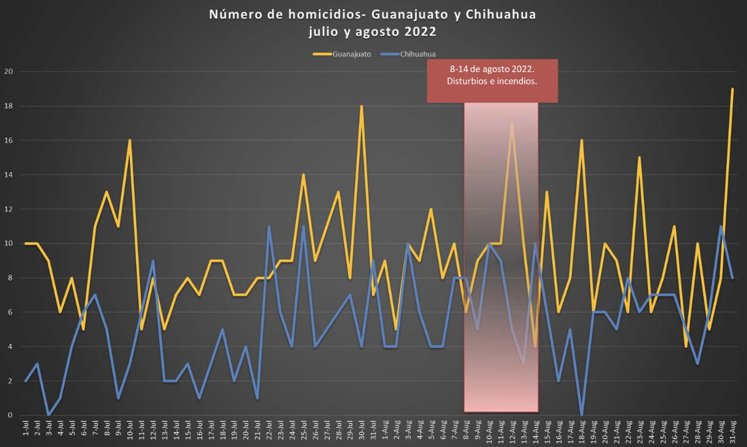 La tasa de homicidios en Guanajuato se incrementó de 146.53 homicidios en junio a 148.59 en agosto. El 12 de agosto, mientras se incendiaban establecimientos comerciales, se alcanzó un pico de 17 homicidios. La tasa de homicidios en Chihuahua también aumentó de junio a agosto (de 3.66 a 5.02), pero no se observó un incremento considerable de la violencia en la semana que se presentaron los disturbios. Tal vez las diferencias entre los dos estados se deban a que en Chihuahua los disturbios sólo se concentraron en Ciudad Juárez o porque fue el único caso en donde dichos disturbios sí causaron víctimas mortales, por lo que podríamos estar hablando de eventos distintos. A pesar de que los homicidios en los dos estados se incrementaron en agosto, en comparación con julio, el presidente reportó que no hubo muertos cuando quemaron vehículos y comercios, por lo que no había de qué preocuparse.