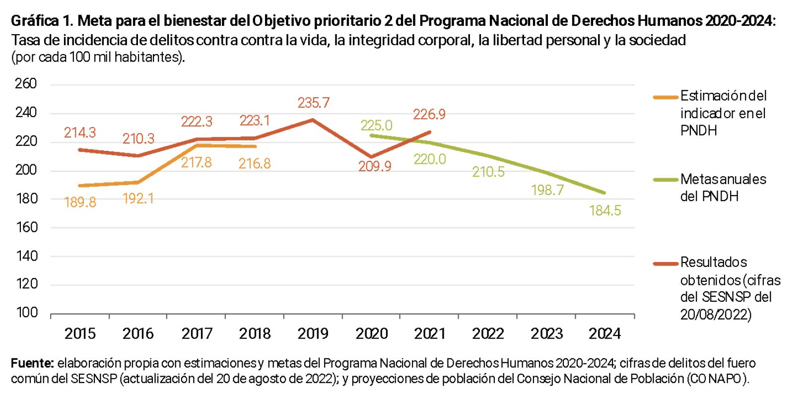 El indicador del PNDH salva las críticas anteriores, presenta estimaciones 2015-2018 y propone metas para 2020-2024. No obstante, esto hace evidente otro serio problema: toda vez que el SESNSP permite a las fiscalías cambiar sus series históricas en cada reporte mensual (borran y añaden casos con total libertad para cualquier mes y año), es imposible replicar las tasas calculadas durante la elaboración del PNDH (el SESNSP borra archivos anteriores y sólo publica el último reporte). La gráfica 1 muestra este indicador oficial y sus metas anuales versus las cifras más recientes del SESNSP (actualización del 20 de agosto de 2022), y devela lo siguiente: