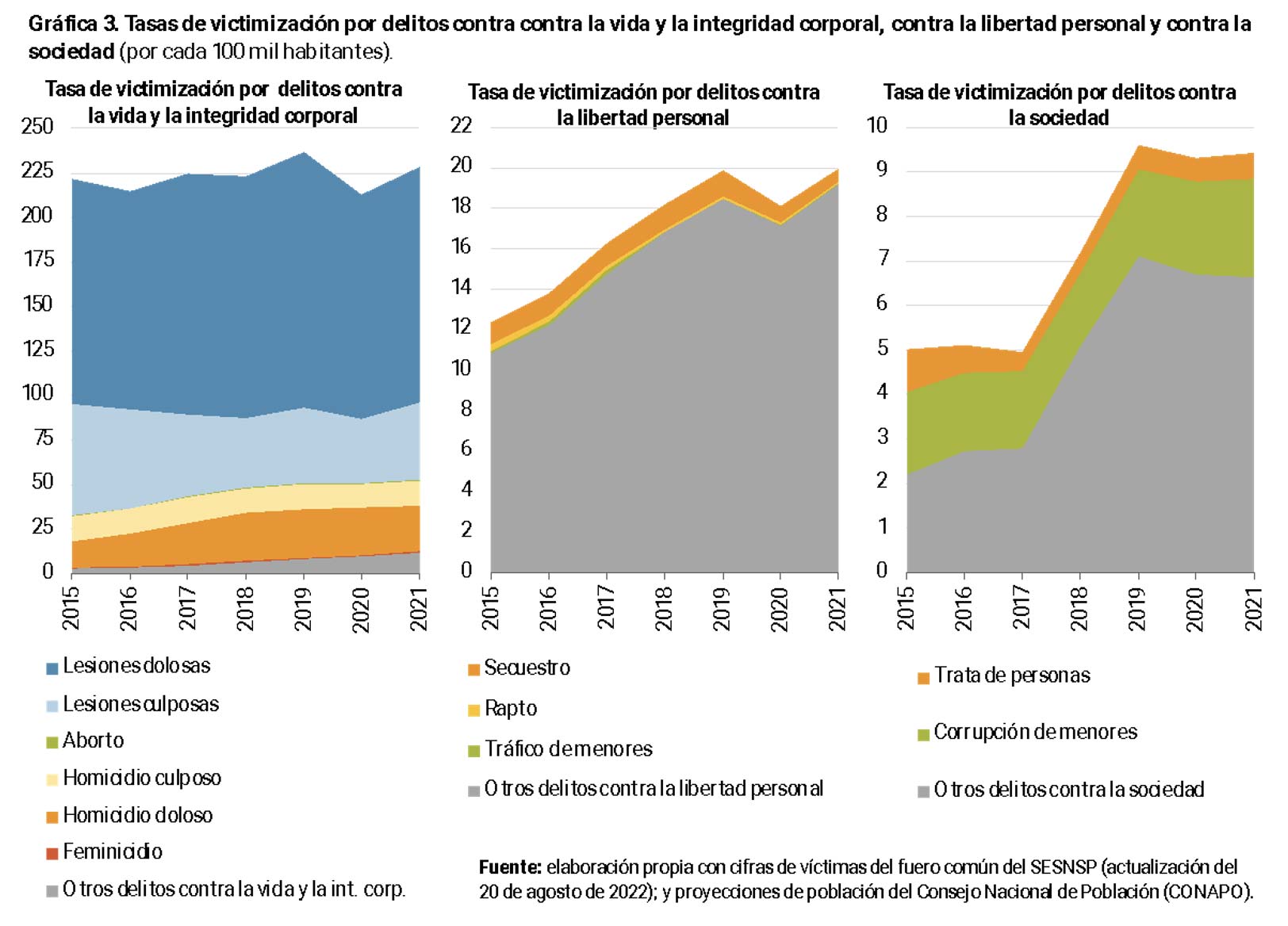 La gráfica 2 muestra la desagregación de la tasa por subtipos de delitos. Esto permite observar el peso relativo de las categorías de “otros” delitos según la clasificación del SESNSP, así como el dramático aumento de los “otros delitos contra la libertad personal” y de los “otros delitos contra la sociedad”.