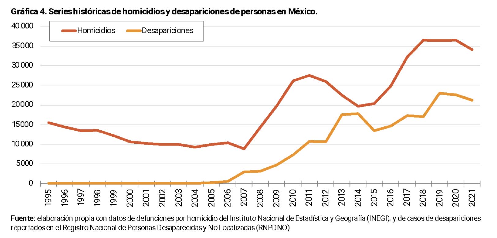 La gráfica 3 muestra tasas de victimización para los mismos subtipos de delitos. Al compararlas con la gráfica 2 se observa que son mayores que las tasas de incidencia delictiva, especialmente para delitos contra la libertad personal. Este grupo es crucial, en cuanto a problemáticas de medición, porque su subtipo de “otros” tiene el mayor peso relativo y la tendencia más marcada de aumento. Es posible que las fiscalías estén anotando, dentro de esa categoría de “otros”, una variedad de delitos relacionados con la privación ilegal de la libertad (pero sin una metodología pública es imposible saberlo), tales como desaparición forzada y por particulares, los cuales también pueden ser causa de subregistro de homicidios dolosos (al no encontrar un cadáver no se registra el homicidio). En la gráfica 4 se muestra la evidente correlación de las series históricas de defunciones por homicidio del Instituto Nacional de Estadística y Geografía, y de casos reportados por el Registro Nacional de Personas Desaparecidas y No Localizadas.