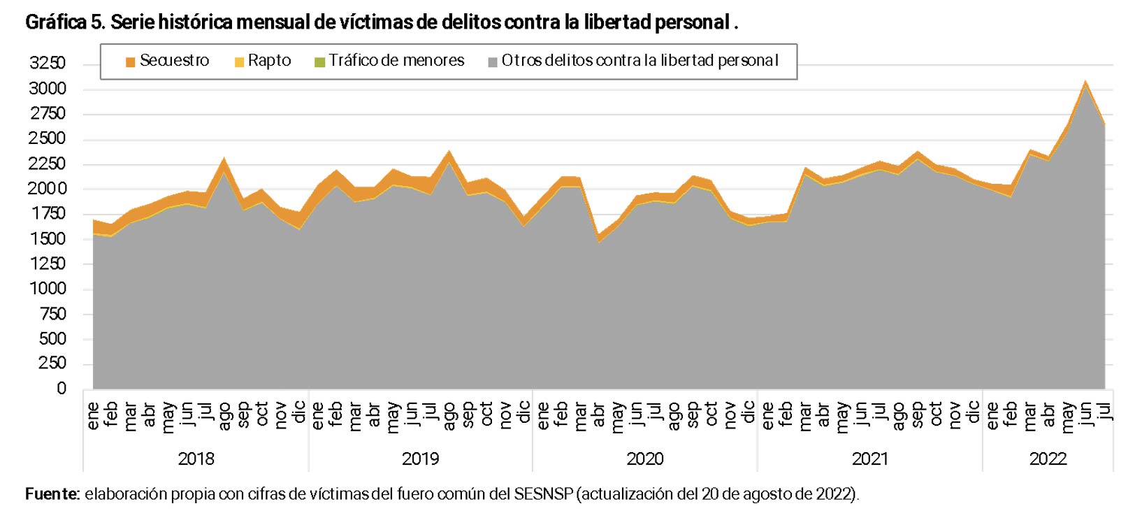 Al considerar todas estas cifras (gráficas 1 a 4) como un conjunto de datos que, si presentara menos problemas de calidad y congruencia, pudiera servir para valorar la situación actual de inseguridad, se entiende por qué es imposible afirmar, con base en la evidencia oficial disponible, que las condiciones del país estén mejorando. De hecho, algunos rubros están empeorando drásticamente, tales como los crímenes contra la libertad personal y contra el libre desarrollo de la personalidad (trata de personas y otros similares). Para los más escépticos se incluye la gráfica 5, con el conteo mensual de víctimas de delitos contra la libertad personal. Todo lo anterior sin considerar la magnitud de la cifra negra.