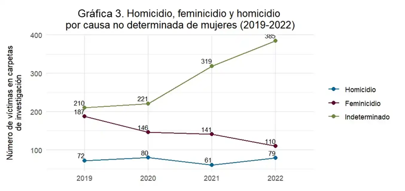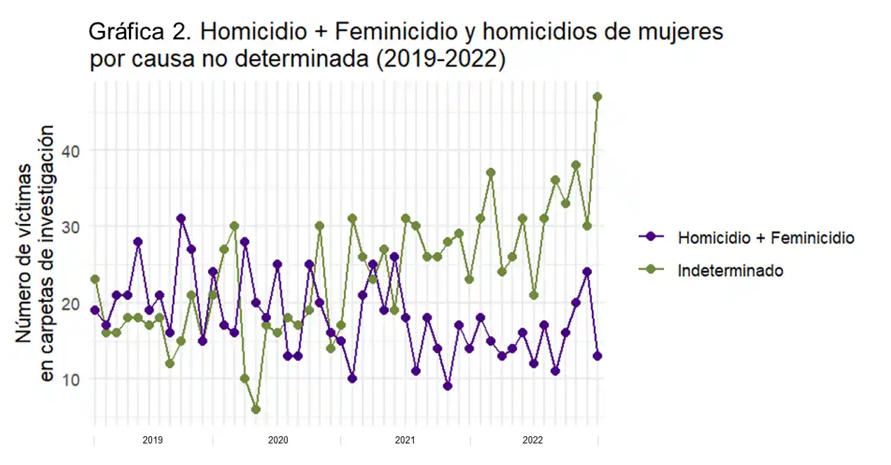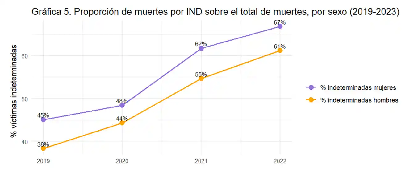 Aunque las muertes de mujeres por homicidio y feminicidio han mostrado una tendencia a la baja desde 2019, de manera simultánea y en mostrando una tendencia contraria, las muertes violentas de mujeres por IND han experimentado un aumento. En otras palabras, mientras disminuyen los homicidios y feminicidios, se observa un incremento en las muertes violentas de mujeres catalogadas como causa no determinada. Esta tendencia sugiere la posibilidad de que exista un ocultamiento de cifras por parte de la Fiscalía, una conclusión respaldada por análisis previos que no consideraron la diferenciación por sexo.