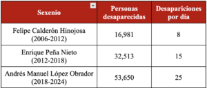 Es en este contexto que, al cierre de 2025, se tenía registro de 133,552 personas desaparecidas. La inmensa mayoría de los registros (89%) corresponden a los últimos 19 años. En una vista sexenal, el gobierno de López Obrador es el periodo con la mayor cantidad de registros en la historia.
