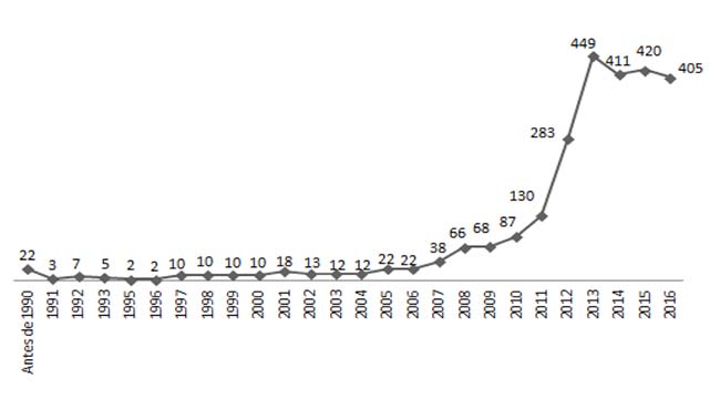 En contraparte, hay entidades con muy pocas organizaciones en la materia, como Campeche y Colima con cinco y 11, respectivamente. Esto es particularmente inquietante en el caso de Colima, que en los últimos meses registra un incremento exponencial de violencia que se refleja en sus estadísticas de incidencia delictiva. Del total de las organizaciones que aquí se estudian, 68.5 por ciento se crearon en los últimos cinco años. Las más antiguas, por otro lado, se constituyeron en los años ochenta.