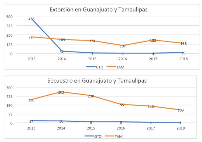 Una tercera hipótesis es que el robo de combustible podría estar funcionando en los hechos como una válvula de escape que ha contribuido a la disminución de delitos como el secuestro y la extorsión. Bajo esta lógica, los grupos criminales, al encontrar una fuente de ingresos significativa en el robo de combustible, optarían por esta opción antes que por delitos como el secuestro o la extorsión. No se trata de una apología del robo del combustible, pero es un factor que debe tenerse en cuenta antes de lanzarse a una campaña de lleno contra dicho delito. En otras palabras, se debe combatir el robo de combustible tomando en cuenta las posibles consecuencias en otros delitos. Para ilustrar lo anterior es posible observar los casos de Guanajuato y Tamaulipas, dos de los estados con mas tomas clandestinas para robo de combustible.