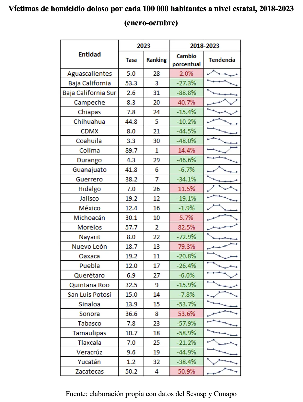 De 2018 a 2023, las víctimas de homicidio doloso por cada 100 000 habitantes se redujeron 15.1 % a nivel nacional. En lo local, el fenómeno se replica en 23 entidades. El caso de la Ciudad de México (CDMX) ha tenido especial resonancia mediática. En textos recientes publicados en nexos, Vanessa Romero y Carlos Pérez Ricart sostienen que no existe una reducción artificial del homicidio doloso en la capital, como han sugerido analistas y periodistas debido al incremento paralelo de las defunciones por causa indeterminada, sino un “teléfono descompuesto”entre la Secretaría de Salud (Sedesa) y la Fiscalía General de Justicia (FGJ) que impide catalogar adecuadamente los decesos y que, no obstante, la violencia mantiene una tendencia a la baja; Quetzali Romero y Andrés Ruiz, y David Pérez Esparza y Andrés Sumano, respectivamente, rebaten la afirmación con datos a nivel alcaldía o comparando las estadísticas con otras entidades.