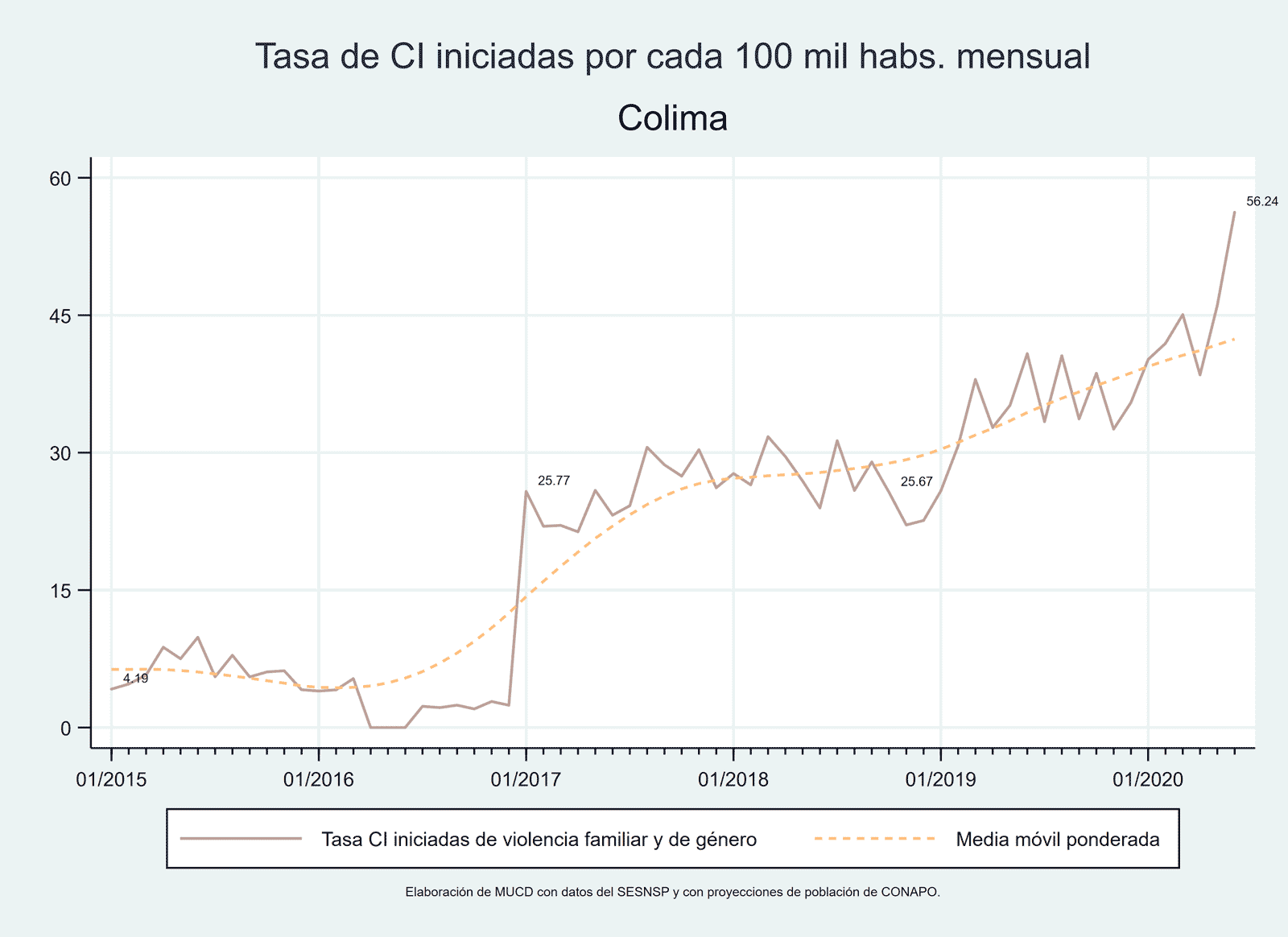 Esto nos indica que Colima no solo registra las tasas más altas de homicidio doloso y feminicidio, sino que también tiene la tasa más alta de violencia familiar y de género, tanto anual (268) y en la mensual (56.24), en ambos casos superando a la tasa nacional (acumulada 83.28 y mensual 15.6).