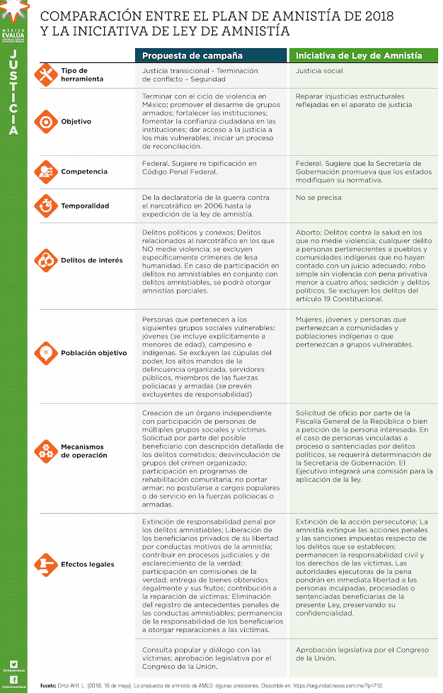 A esta deuda le sigue el gesto político: el 15 de septiembre de 2019, el presidente envió a la Cámara de Diputados la iniciativa para una Ley de Amnistía. El objetivo es conceder libertad y dar nuevas oportunidades de reinserción social a quienes han cometido conductas delictivas empujados por la pobreza, los entornos de violencia y otros tipos de vulnerabilidades. El documento hace eco del decálogo de acciones en materia de seguridad que presentó López Obrador durante su campaña. Entonces, incluyó el otorgamiento de amnistías para “conseguir la paz, la tranquilidad y terminar con la guerra”. Sin embargo, la iniciativa actual dista considerablemente del plan de amnistía avanzado en 2018, como se aprecia en la siguiente tabla: