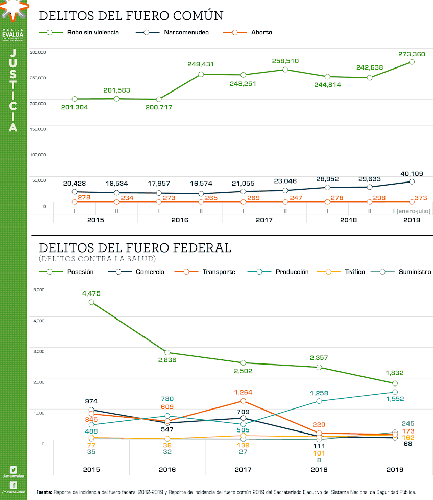 El primero es su carácter federal, lo que acarrea una operatividad acotada. Es decir, en su competencia no entran los delitos del fuero común, que son los de mayor incidencia. Al cierre de junio de 2019 había 200,753 personas privadas de la libertad en México. De estos encarcelamientos, 84 por ciento pertenecían al fuero común. En otras palabras, existen 169,520 personas a las que la iniciativa no alcanzaría. Cifras del ámbito estatal retratan que de las 98,310 personas que ingresaron a centros penitenciarios a cargo de las administraciones públicas estatales en 2017, alrededor de 39 por ciento lo hicieron por el delito de robo. Así, los delitos sobre los que la iniciativa podría impactar son reducidos. La siguiente gráfica muestra, además de la evolución de estos delitos, la desproporción entre fueros.
