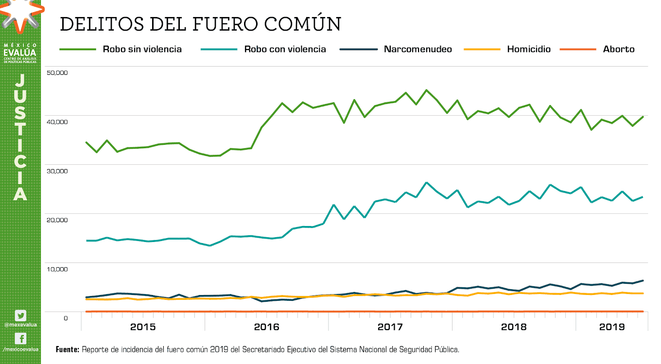 Un segundo obstáculo es que, mientras en la exposición de motivos se menciona que deberá existir sentencia firme para que la persona solicitante de amnistía pueda beneficiarse, la iniciativa establece que podrán ser amnistiadas las personas contra las que “se haya ejercitado o pudiera ejercitarse acción penal”. En todo caso, se señala que la amnistía será aplicable únicamente en delitos que se hubieren cometido antes de la entrada en vigor de la ley. Esto es comprensible pues, idealmente, las leyes de amnistía tienen efectos retroactivos. Sin embargo, la población procesada y recluida de delitos del fuero común no ha disminuido en esta administración. En el primer semestre de 2019, por primera vez en cinco años, la población carcelaria registró un aumento con respecto del semestre anterior. Si no se atienden de fondo las causas que provocan estos índices, pronto los mismos sectores de la población se encontrarán en la cárcel sin una Ley de Amnistía que les sea aplicable. La siguiente gráfica muestra la evolución de algunos de los delitos de interés en el fuero común.