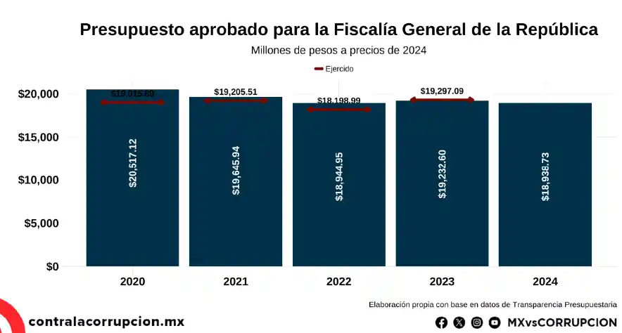 Entre 2020 y 2024, la Fiscalía experimentó un ajuste presupuestal sin variaciones significativas. El presupuesto aprobado disminuyó de aproximadamente 20 517 millones de pesos en 2020 a cerca de 18 939 millones en 2024, una reducción de 7.7 % en términos reales. Esta disminución también se reflejó en el presupuesto ejercido, con la excepción de 2023. Es decir, se terminó gastando todavía menos de lo que originalmente había sido aprobado.