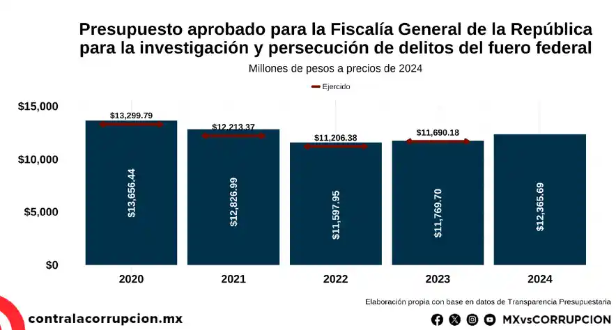 Los recursos destinados específicamente para la investigación y persecución de delitos del fuero federal también siguieron una tendencia hacia la baja, aunque con una estabilidad proporcional. En 2020, aproximadamente dos tercios del presupuesto total de la Fiscalía, 66.6 %, estaban dedicados a esta función esencial, cifra que disminuyó ligeramente a 65 % en 2024. A pesar de esta estabilidad relativa, el presupuesto aprobado para la investigación y persecución de delitos federales se redujo de 13 656.44 millones de pesos en 2020 a 12 365.69 millones de pesos en 2024, una contracción de casi el 10 % en términos reales. El presupuesto ejercido se redujo 7.7 % de 2020 a 2022, con un incremento posterior del 2 %, pero aún por debajo de los niveles de inicio de sexenio.