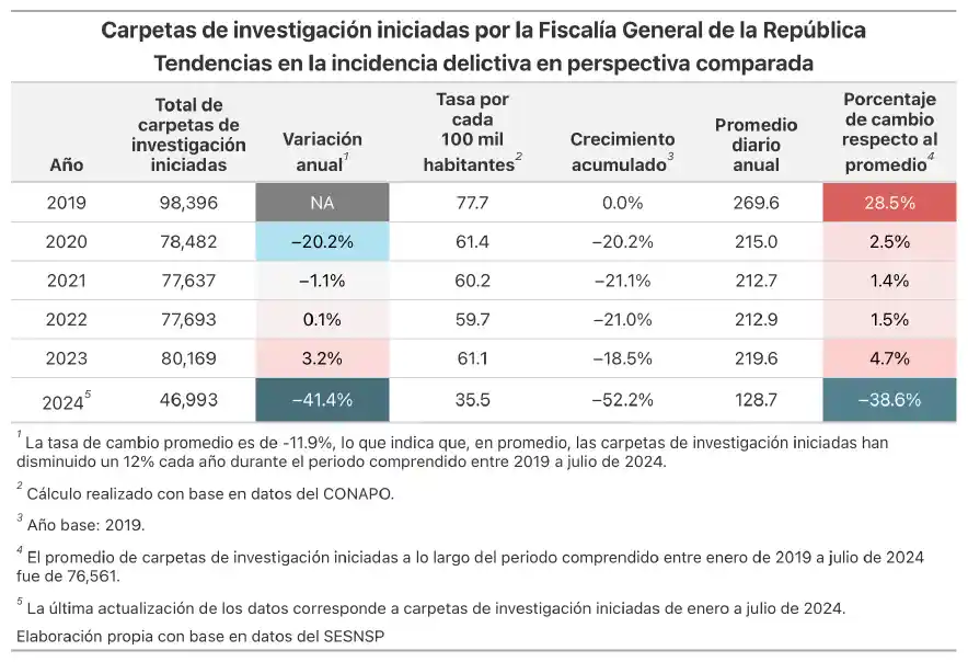 El análisis de las carpetas de investigación iniciadas por la Fiscalía entre enero de 2019 a julio de 2024 muestra que, en promedio, las carpetas de investigación iniciadas han disminuido alrededor de un 12 % cada año. La reducción más pronunciada se observa en 2024, con una caída del 41.4 % respecto al año anterior; sin embargo, es importante considerar aún no se dispone de información completa para evaluar el 2024 en su totalidad.