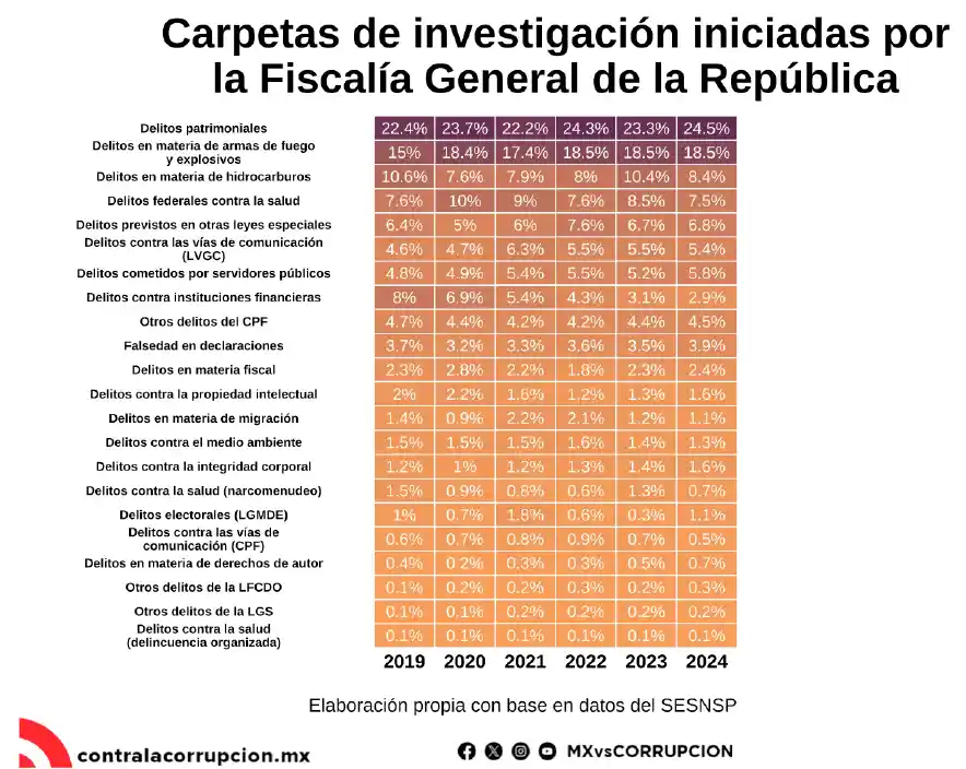 Por otro lado, los delitos en materia de armas de fuego y explosivos también mantienen una alta prevalencia, concentrando un promedio de 18.5 % o una de cada cinco de las investigaciones abiertas. En contraste, los delitos contra instituciones financieras, que representaban el 8 % en 2019, se redujeron significativamente a sólo el 2.9 % en 2024, mostrando una caída a menos de un tercio de su incidencia inicial. Otros delitos, como los ambientales y en materia de migración, mantienen una baja proporción, con alrededor de una de cada 100 carpetas de investigación abiertas.
