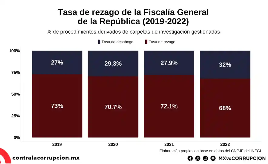 Desde 2019, las carpetas de investigación abiertas por la Fiscalía General de la República (FGR) han disminuido un promedio de 12 % anual, lo que supone una menor carga de trabajo al ingresar menos casos que deban ser procesados. Sin embargo, esta reducción no ha mejorado la resolución de los casos, ya que entre 2019 y 2022, años para los cuales se dispone de datos públicos, siete de cada diez casos gestionados permanecieron sin ser resueltos, incrementando el rezago.