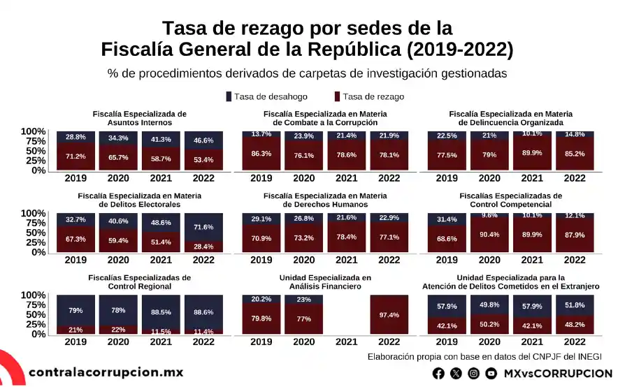 Por su parte, la Fiscalía de Asuntos Internos muestra un rezago del 62.2 %, mientras que las Fiscalías Especializadas en Combate a la Corrupción y en Derechos Humanos registran tasas de 79.7 % y 74.9 %, respectivamente. La Fiscalía de Delitos Electorales, con un rezago del 51.6 %, presenta un desempeño intermedio, pero aún enfrenta dificultades significativas para gestionar la carga de trabajo.