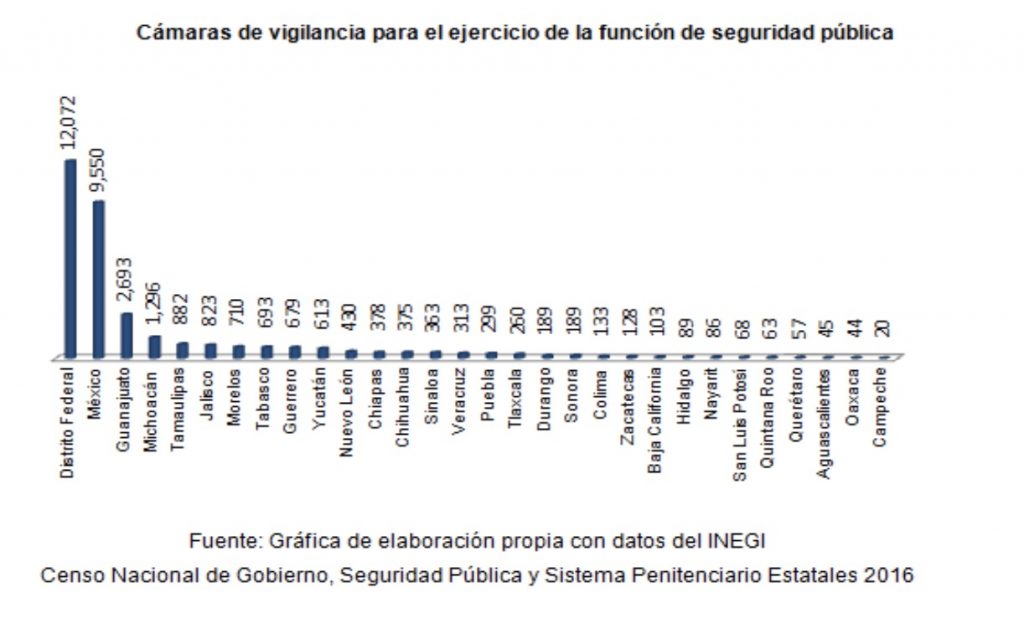 La demanda ciudadana de videocámaras de vigilancia y las propias necesidades de seguridad a nivel local han llevado a los gobiernos a invertir recursos públicos en la instalación de estos sistemas. De esta manera, considerando los datos reportados al INEGI, en 2016 operaban 33 mil 646 videocámaras de vigilancia para el ejercicio de la función de seguridad pública en todo el país, destacando Ciudad de México con 12 mil 72, el Estado de México con nueve mil 550, Guanajuato con dos mil 693 y Michoacán de Ocampo con mil 296 cámaras.